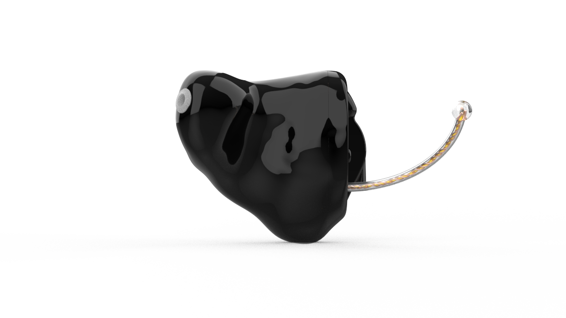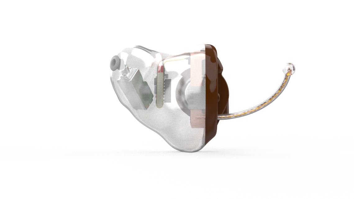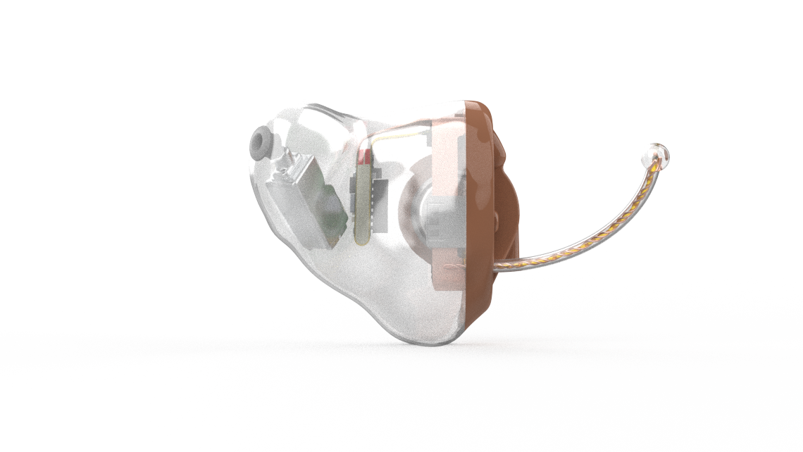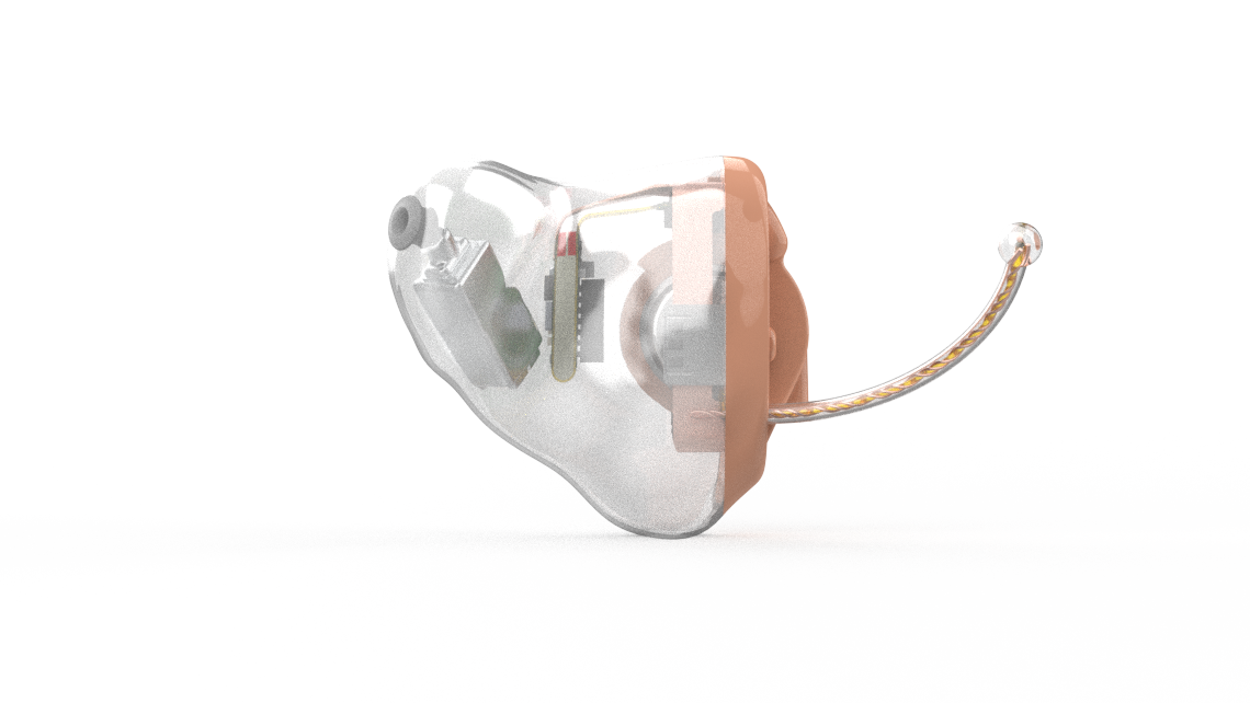 Only the tiny removal handle of the hearing aid shows outside of the ear canal.